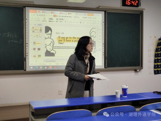校园网讯 为夯实英语专业师范生跨文化教学核心素养,帮助学生更精准地把握跨文化能力融入中小学英语课堂的思路与方法,11月18日下午,外语学院教师杨天麟带领所授班级开展了跨文化能力教学实践活动。活动特邀岳阳市第九中学教师徐军兰、周正、赵蕴、肖欢参加指导与评议,外语学院实习带队教师何丹担任教学指导,英语24-1BS、24-2BS两个班全体学生参与。