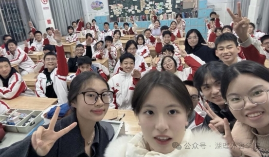 课堂上,初中生参与热情高涨,频频举手发言,现场气氛活跃。班会结束后,不少学生意犹未尽,主动与实践小组成员交流互动、合影留念,外语学院师范生更是收获了“明星般”的欢迎与认可。多位班主任对本次班会活动给予了高度评价,认为活动内容贴近学生实际,形式新颖,有效激发了学生的思考与参与热情。这种真实而直接的反馈,让参与实践的同学深切感受到中学课堂的生命力,也增强了未来走向教学岗位的信心与使命感。
