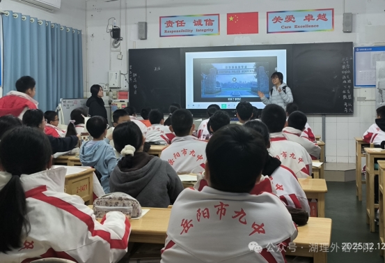 校园网讯 为深化跨文化实践育人,提升师范方向学生的跨文化教学意识与教学能力,12月12日下午,外语学院《跨文化交际实践》课程任课教师杨天麟带领三个跨文化实践小组王珂、张楷婕等11名同学,走进岳阳市第九中学,在初一、初二年级多个班级开展跨文化主题班会活动。活动通过贴近学生生活的方式,引导中学生认识文化差异、理解多元文化,也为外语学院师范生提供了一次真实、生动的中学课堂实践体验。