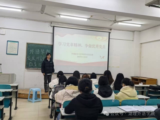 活动围绕“学习党章精神,争做优秀党员”核心主题展开。熊心雨结合党的最新理论成果与外语专业特色,系统解读了党章的发展历程、核心要义及新时代党章对党员的新要求,重点阐述了党员的权利与义务、党的组织原则等关键内容,并思考如何在涉外交流、文化传播等领域践行党员使命,以实际行动向党组织靠拢。参会发展对象认真聆听、积极记录,纷纷表示此次学习让自己对党章有了更深刻的理解,党性修养得到进一步提升。