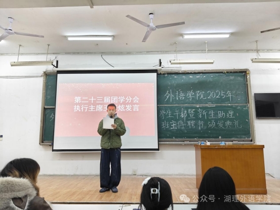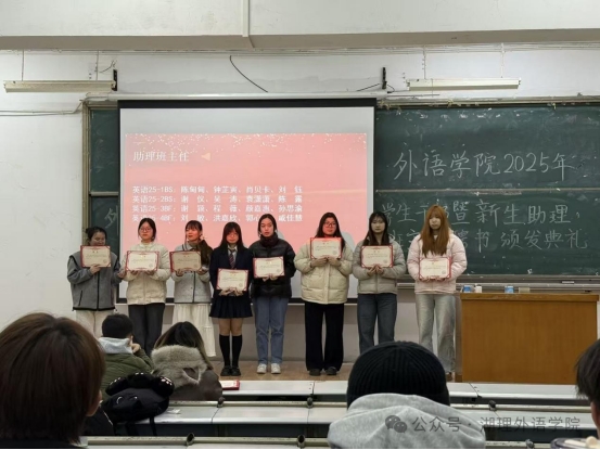 校园网讯 12月28日,外语学院于8T1举办2025年优秀学生干部暨新生助班聘书颁发典礼,外语学院23届、24届团学分会主席团成员及干部参加,2025级全体学生到场观礼。
