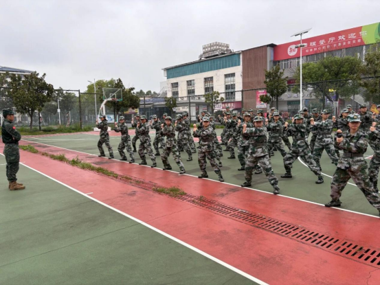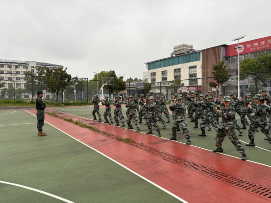 军体拳集体演练的场景,是雨中最动人的画面。照片里,数人的军体拳方阵如“复制粘贴”般整齐,同一时间出拳、同一角度格挡,迷彩衣袖在空中划出统一弧线,雨珠随着动作纷纷洒落。队伍边缘的同学即便处于镜头角落,也没有丝毫松懈,动作幅度、节奏与中心队列完全一致,用整齐划一的招式,诠释着外院新生的集体荣誉感。
