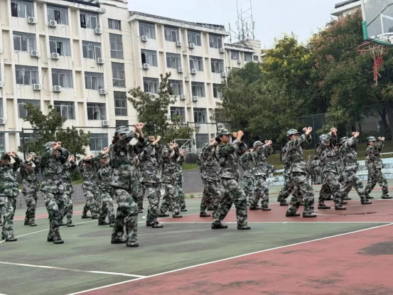 篮球场上,一身迷彩的新生们动作刚劲有力,擒敌拳的每一招每一式都透着一股不服输的韧劲。出拳、踢腿、转身……动作整齐划一,在红绿相间的场地上,他们化身“迷彩战士”,将汗水洒在每一次出拳的轨迹里。