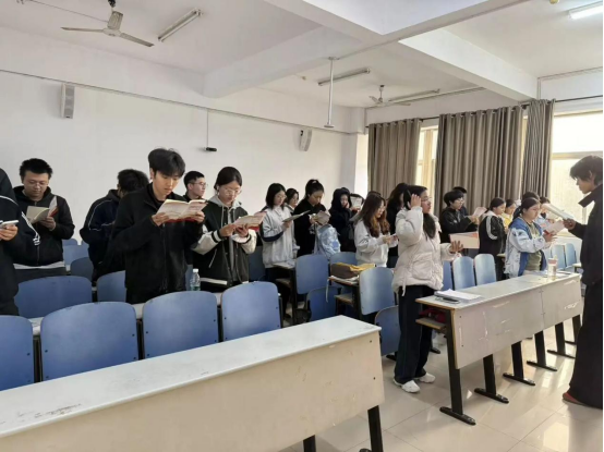 总有一种情感,穿越时空而历久弥新;总有一种力量,植根血脉而磅礴浩荡,那便是爱国之情。它如星辰指引方向,如火炬照亮心灵,更如不息的脉搏,在每一个中华儿女的血脉中铿锵跳动。今天,外语学院的莘莘学子,正以青春之声为媒介,以琅琅诵读为誓言,在“立报国强国大志向,做挺膺担当奋斗者”的课前三分钟里,重温那段融于血脉的珍贵记忆,共同触碰历史长河中那些激动人心的瞬间,让爱国主义的伟大旗帜在心中高高飘扬。