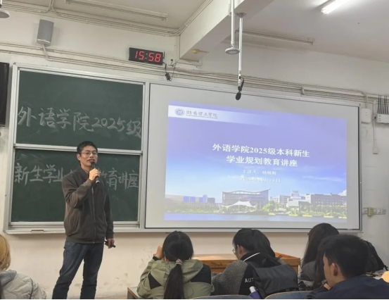 校园网讯 10月28日下午,外语学院组织2025级新生于学院15栋教室开展新生学业规划教育讲座,杨稼辉副教授担任主讲人,2025级全体外院学生参与。