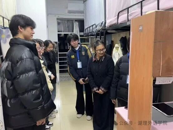 本次检查评审团队依据卫生整洁、物品收纳、安全规范、文化建设四大核心标准,采取“实地走访+现场打分”方式开展全面核验。检查中,外语学院的部分候选寝室充分发挥专业特色,将外语角、外国文化主题墙等元素融入寝室布置,打造出兼具学习氛围与国际视野的文化空间,展现出外语学子良好的集体凝聚力与创新实践能力。同时,检查组重点排查违规电器使用、消防通道堵塞等安全隐患,现场开展安全文明宣讲,引导学生强化自我管理意识。