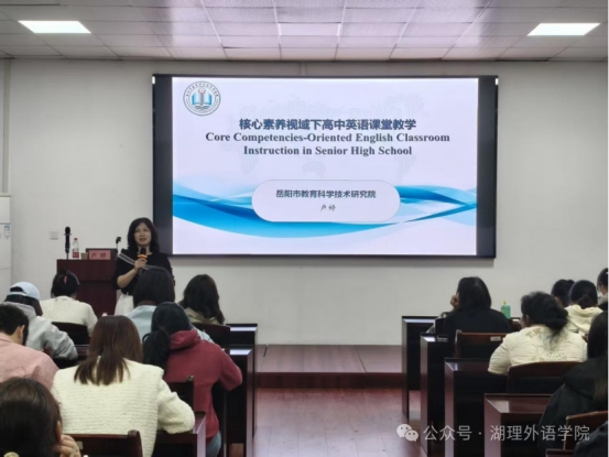 校园网讯 2026年4月21日下午,外国语学院“湖滨讲堂”专题讲座在8栋教学楼108教室举行。本次讲堂特邀岳阳市教育科学技术研究院卢婷老师主讲,主题为核心素养视域下高中英语课堂教学,学院众多师生共同参与学习交流。