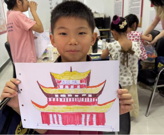 随后的绘本创作环节,画笔成为孩子们表达世界的魔法棒。彩铅在纸上飞舞,巴陵广场的轮廓渐渐清晰,岳阳楼的飞檐也跃然纸上。孩子们用彩笔在纸上一笔一笔画下生动的岳阳楼,融入他们美好童真的想象,创意十足。这一刻我深刻体会到:教育不是填满容器,而是点燃火焰——每个孩子都是天生的创造者与表达者。