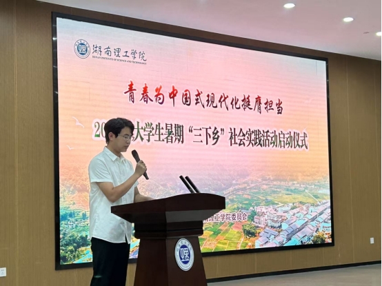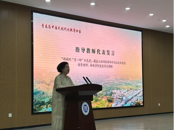 物电学院党委书记周畅作为指导教师代表,讲述物电学院 “三下乡” 实践故事。物电学院组建团队挖掘湖南红色资源,走访旧址、访谈党员,传承革命精神,教师也会继续做好引路人,带学生深耕实践。