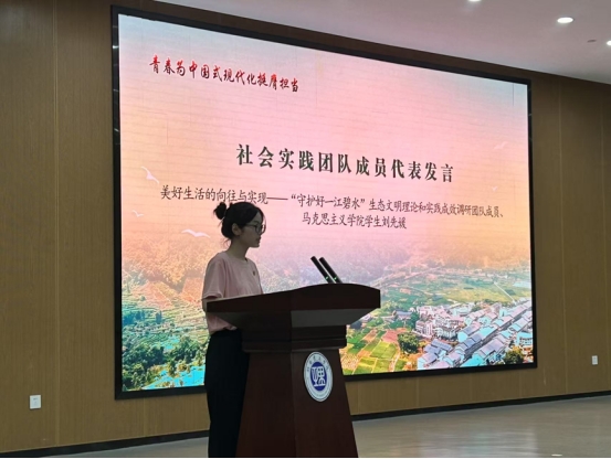 “守护好一江碧水”生态文明理论和实践成效调研团队成员、马克思主义学院学生刘先媛作为社会实践团队成员代表发言。她分享团队将聚焦生态保护,调研 “一江碧水” 守护成效,还呼吁同学们扎根基层,以实践赋能青春,用行动书写担当。