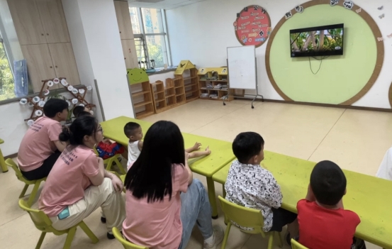 在手工操作课程中,老师播放保护动物的介绍视频,教小朋友去认识并且区分不同的动物,志愿者们在手工剪纸的游戏活动中辅助小朋友提高注意力。用生态自然环境的力量去疗愈孩子的内心。