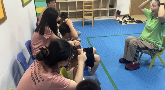 活动伊始,志愿者分成了两组各司其职。第一组志愿者协助大班的老师,第二组志愿者辅助亲子班的老师。